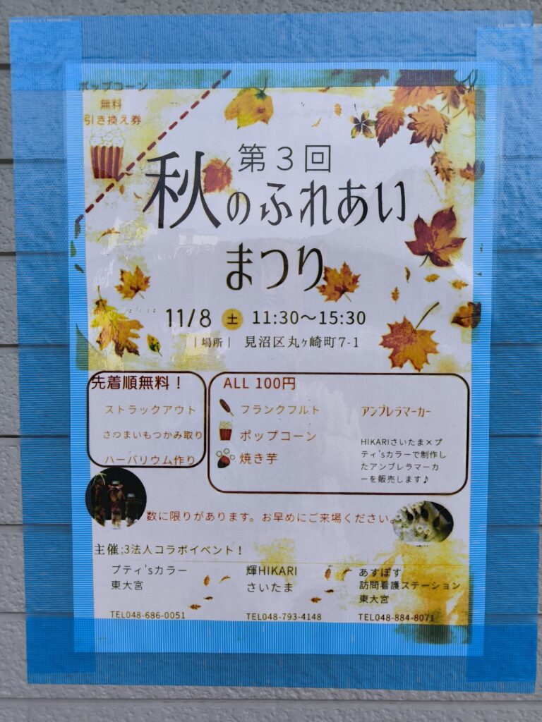 これは、輝HIKARIさいたまがある、さいたま市見沼区丸ケ崎町の福祉3施設(放課後等デイサービス「輝HIKARIさいたま」・就労継続支援B型事業所「プティ‘sカラー東大宮」・あすぽす 訪問看護リハビリステーション東大宮)が合同で開催。