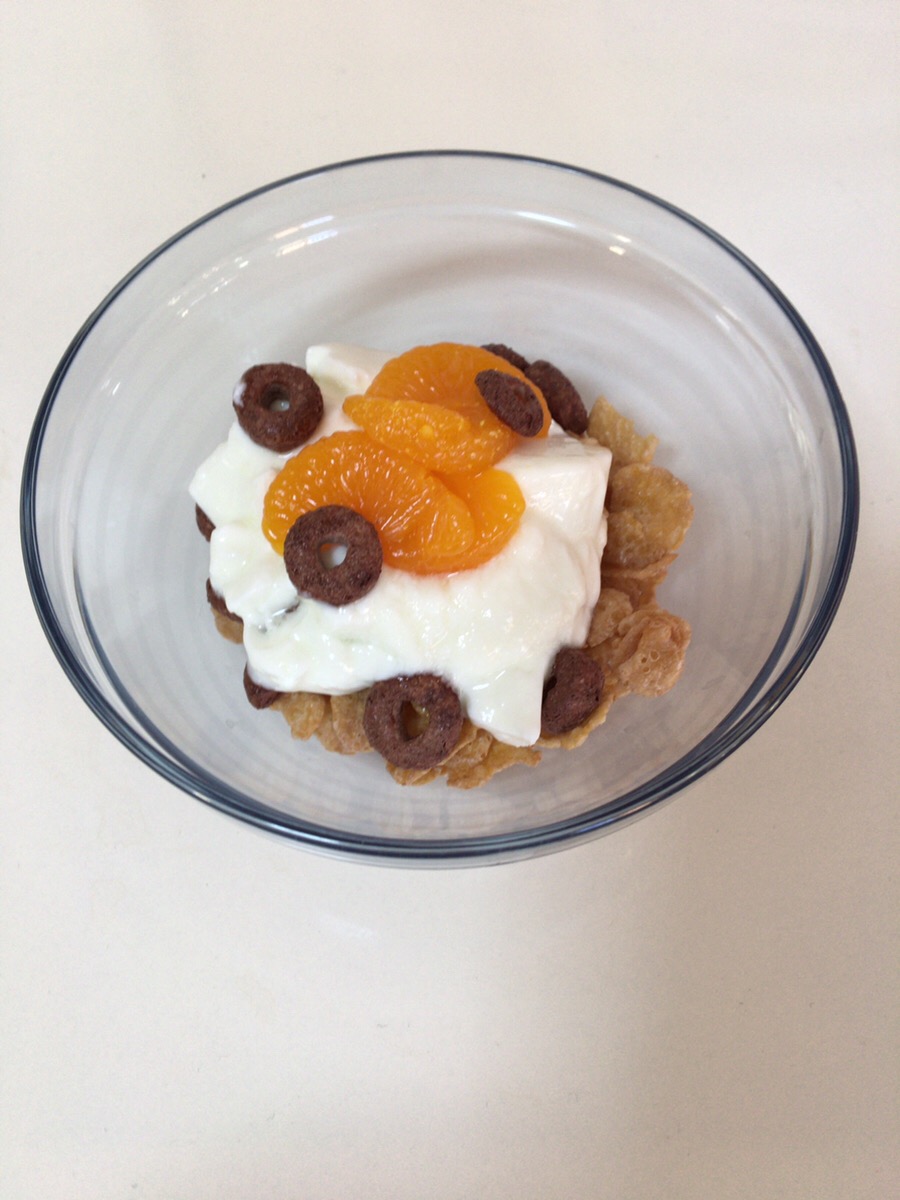 工作の間のおやつには、ヨーグルトやフルーツをトッピングしたフレークをおいしく食べました。