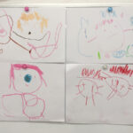 様子:ヒーローが好きなお友だちはそのヒーローの歌をうたいながら描いたり、青のクレヨンを使って「雨」を表現したり、画用紙の片面では足りずに裏面にもいっぱい描いたりと、お子さんそれぞれにお絵描きを楽しめていました。全員が好きなものをイメージして意欲的にクレヨンを動かして描くことができました。