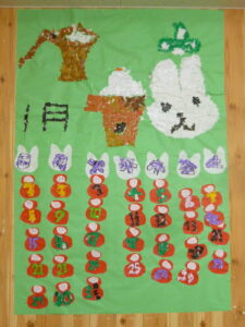 子どもたちにとっては大きな羽子板でしたが、風船を狙いながら振りかぶって上手に打っていました。羽子板が風船に当たると「イエーイ!」ととても嬉しそうでした。何度か繰り返しているうちに、「あか!」「あお!」と風船の色を選びながら、「えい!」と勢いよく打ったりする様子も見られました。