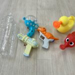 実際の羽根だと小さいので風船に代替えし、牛乳パックで作った羽子板で吊るしてある風船を目がけて打つ練習をしました。