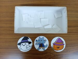 どんどんお菓子のカードも見つけたり、お化けのカードを見つけると「これはだめだ」とまた元の位置に戻していたり、お化けのカードをいっぱい集めて手に持っているお子さんもいました。