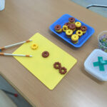 様子:「先生、釣れたよ~」と見せてくれるお子さんや、「テープ貼れないよ。先生、手伝って」と訴えてやり方を覚え、次からは自分で貼れるようになったお子さんや、「もう終わり?もっと釣りたい!」と希望するお子さんや、「サメ釣りたい!」と特定の魚をリクエストしているお子さんもいました。釣った魚で「へい、らっしゃい!」とお魚屋さんごっこを始めるお子さんもいて、大盛況でした。