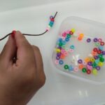 コマは白い画用紙に3色の絵の具から使いたい絵の具を先生に伝えた後、自由に模様を描いて作りました。