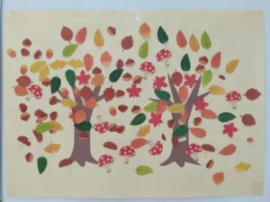 何度も折る工程を重ねて作ったどんぐりは達成感も味わうことができたと思います。折り紙を貼り付けた際にはとても満足そうな笑顔を見ることが出来ました。