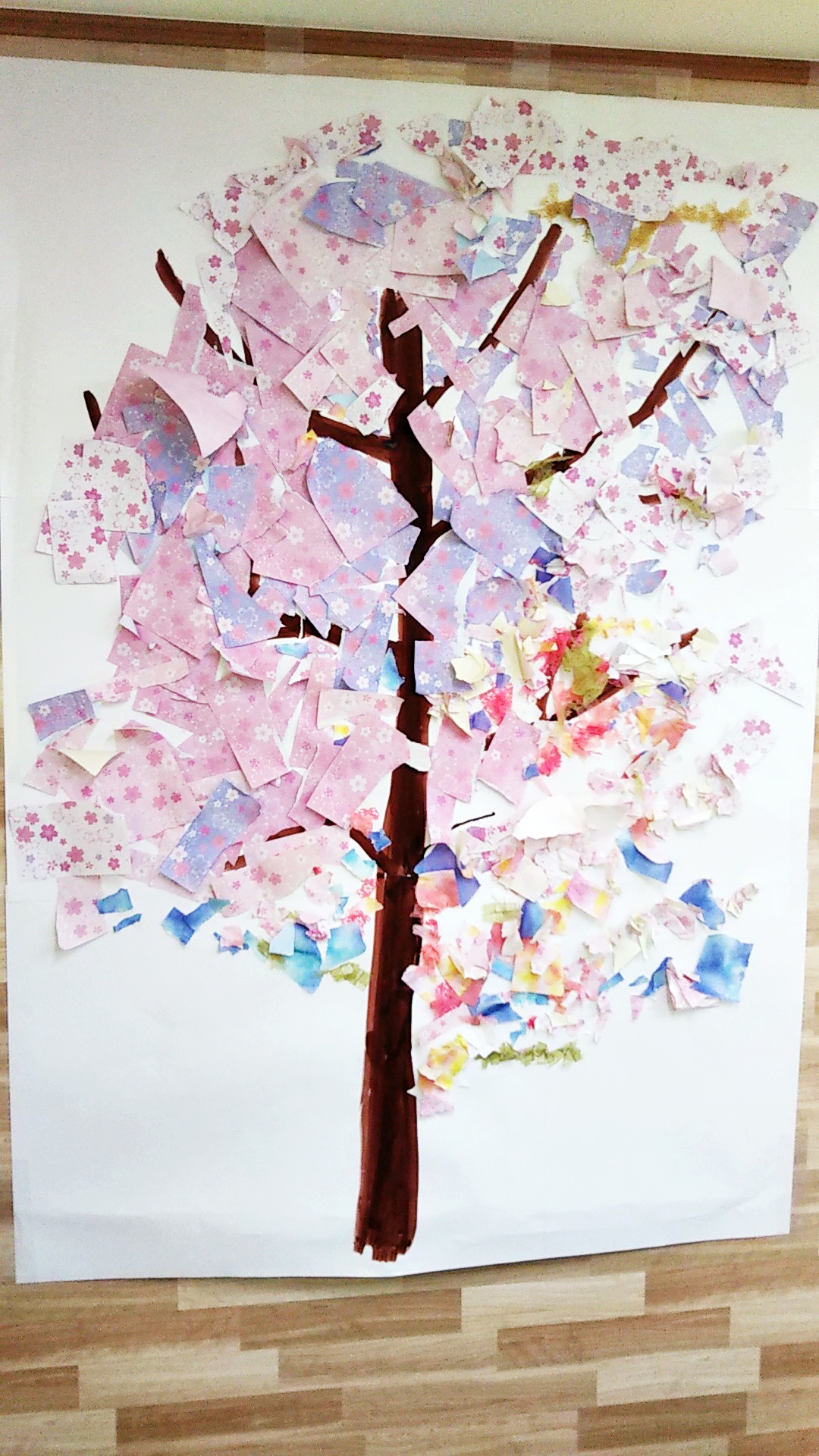 台紙に描いた幹や枝にちぎり絵できれいな折り紙をはりました。