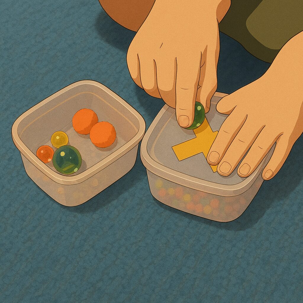 「プットイン」とは、ものを箱などの中に入れる作業で、療育では指先を使った巧緻性や目と手の協調性を高める目的で行われます。この課題を通して、集中力や問題解決能力、因果関係の理解、さらには日常生活の様々な動作(片付けなど)や学習の基礎につながる能力が養われます。