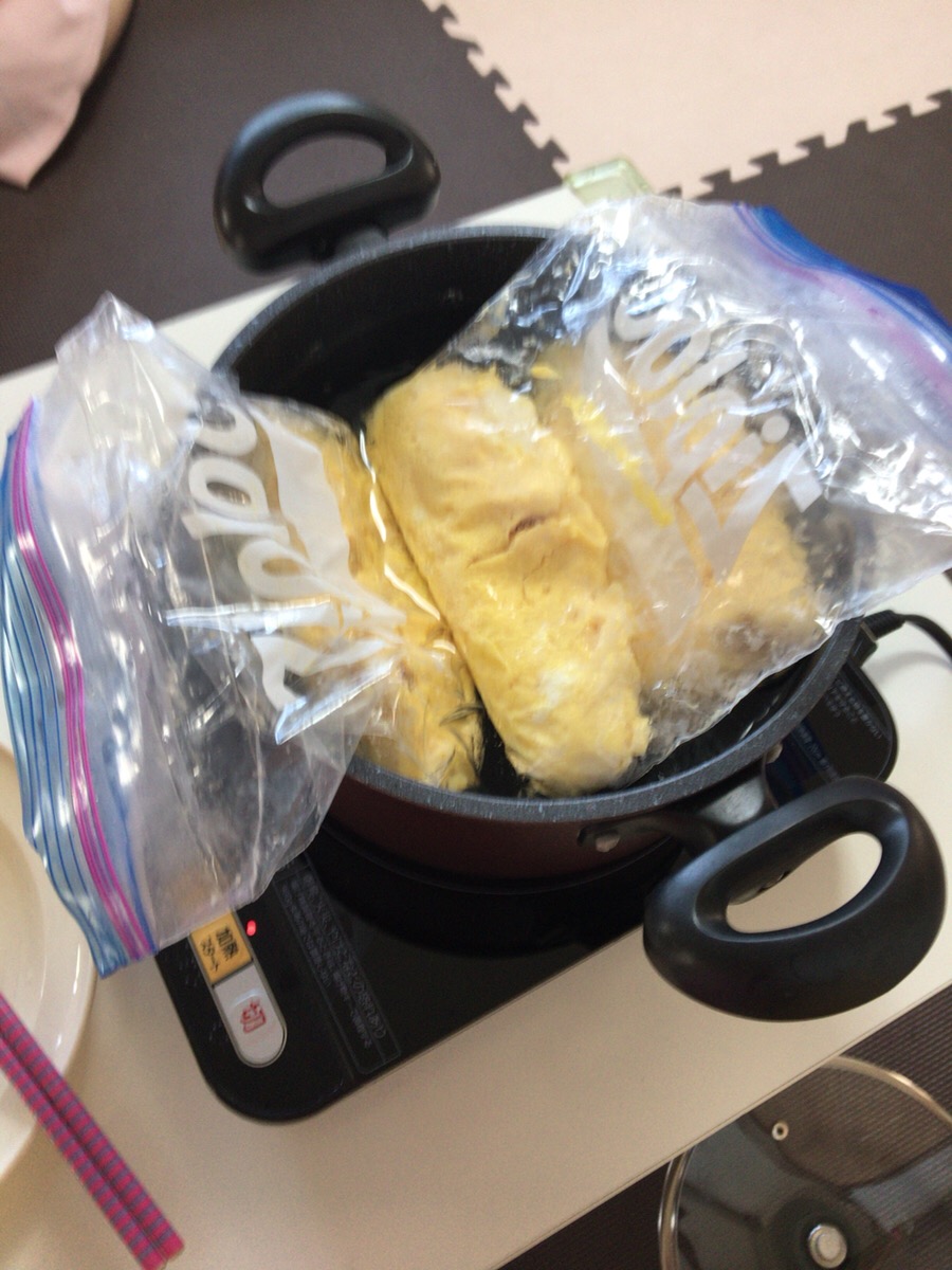 オムレツを作りました 2018-06-04 最終更新日時 : 2018-06-04 NPO法人輝HIKARI 今日の調理実習はかんたんオムレツ作りです。 まず子どもたちに卵を3~4個、ジップロックの中に割ってもらいます。 そこへ塩コショウと牛乳を入れて、よくかき混ぜます。 そのままジップロックごと、沸騰しない程度の温度で湯煎して作ります。 お鍋にジップロックが触れても溶けたりしないように、高温にならない電熱プレートを使っています。 全員ぶんでジップロック3袋、途中で一度かき混ぜてから、固まったら完成です。 人数分に切り分けて、ケチャップでいただきました。 関連