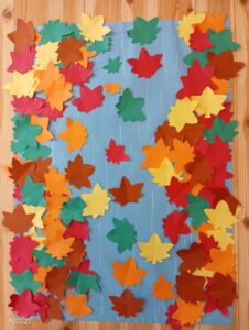 まずは緑の折り紙をちぎって、大きなもみの木を作るところからスタート。子どもたちは線からはみ出さないように丁寧に折り紙を貼り付けていました。同時進行で、スタッフが用意した画用紙に日にちと曜日を書き込みました。