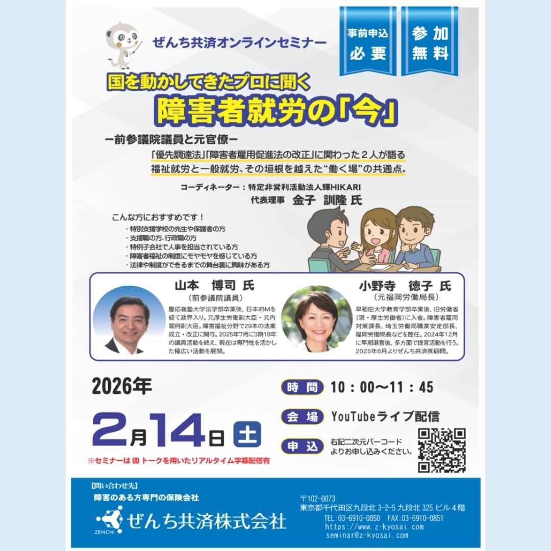 2026年2月14日、日本の障害者就労におけるオンラインセミナーが開催されました。登壇したのは、前参議院議員として長年立法の中枢にいた山本博司氏、厚生労働省で障害者雇用対策課長や福岡労働局長を歴任した小野寺徳子氏、そして親の立場から支援をする団体として、現場の支援を牽引する特定非営利活動法人輝HIKARIの金子訓隆氏です。