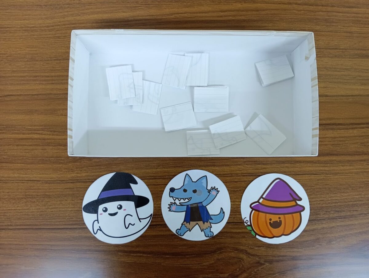 フルーツバスケットのハロウィンバージョンに変え、"おばけ"、"おおかみ"、"かぼちゃ"の3つのキャラクターに分かれてハロウィンバスケットをしました。最初のキャラクターを決めるくじ引きから「やった!おおかみだ〜!」「おばけになったよ〜!」と大盛りあがりでした。「トリック・オア・トリート!」と叫んだ場面では全員が一斉に立ち上がり「きゃ〜!」と言いながら新しい席を見つけていました。室内は子どもたちの歓声や笑い声で溢れていて、楽しい時間を過ごすことができました♪