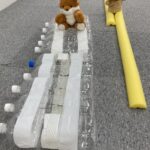 目隠しをしてぐるぐると5回まわって、スタッフやお友達の声に誘導され、棒をふるいます。