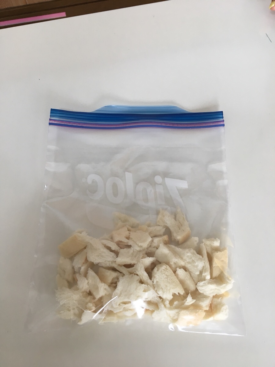 ボウルに入れてかき混ぜた卵・牛乳・砂糖を、ちぎった食パンと一緒にポリ袋に入れます。