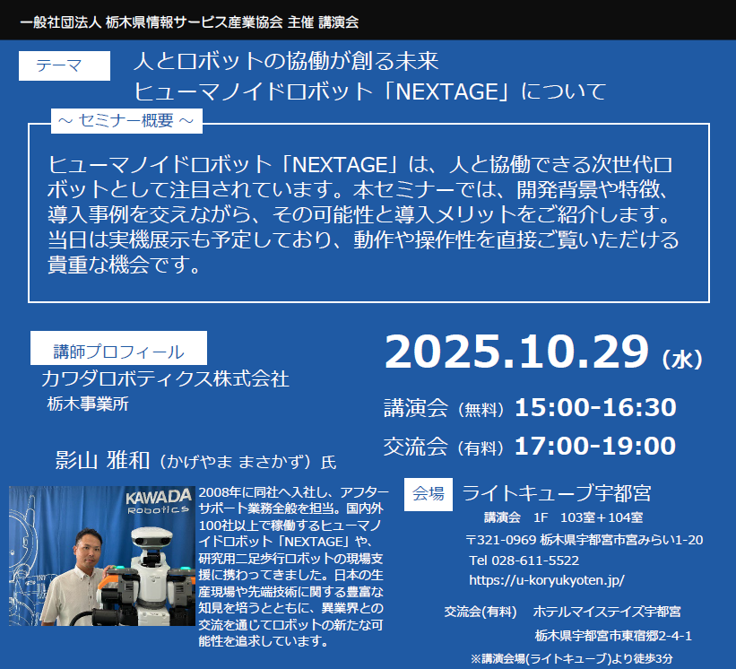 29日の午後からは栃木県宇都宮市にて行われた、一般社団法人 栃木県情報サービス産業協会が主催の講演『人とロボットが協働する未来 ヒューマノイドロボット「NEXTAGE」について』を拝聴しました。