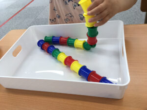 だんだん材料が混ざってくる触感に「固まってきた!すごーい!!」と興味を示し、楽しみながらおやつ作りができました。