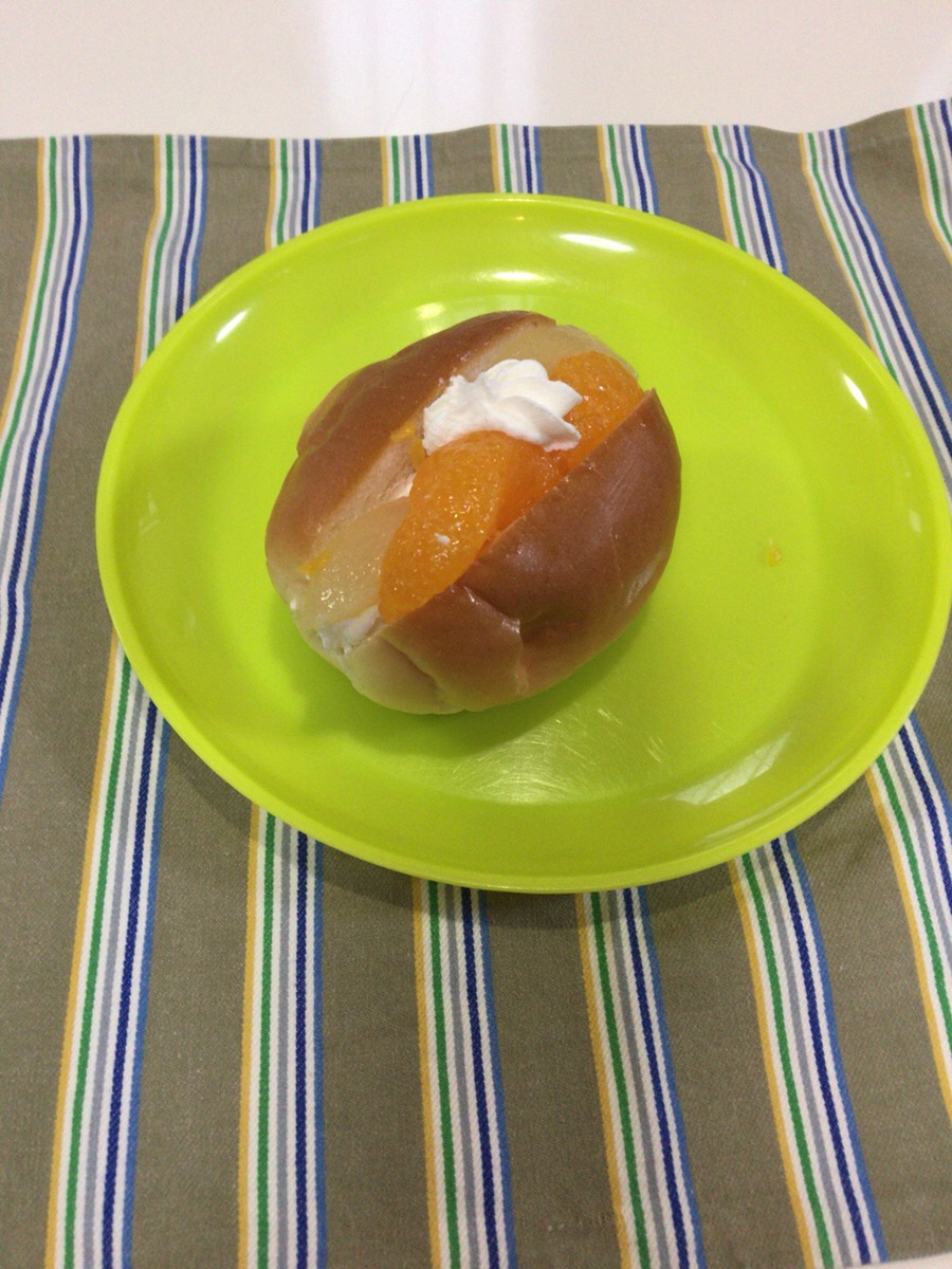 ロールパン、ミカン缶、桃缶、ホイップ を使いました。