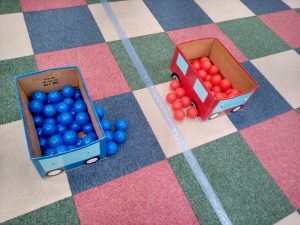 段ボールで作ったピンを並べ、バランスボールを転がしてピンを狙いました。