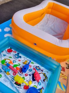 夏の縁日でたまに見かけるスーパーボールすくいを模して、キッズの中でレンゲを使って行なって、すくったボールを流して遊びました。