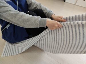 はじめに、倒したカゴの中を狙って両手でボールを転がして入れる「ボール転がし」からスタートしました。お子さん達は、職員が転がしたボールを両手でキャッチする練習も行いました。