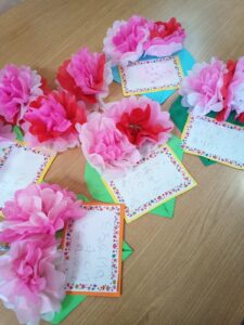 最近輝HIKARIみらいでは、帰りの会が終わった後に希望するお子さんが自分で作ったものなどの発表をしてくれます。自由遊びの時間にお友達とお笑いのコントの台本を作ったり、クイズや絵を書いたりしたものを前にでて発表してくれます。最初の方は恥ずかしがっていて声も小さかったですが、慣れてくると少しずつ声も大きくなり、自信もでてきました。今では堂々と発表をできるようになりました。これからも色々なことに臆せず挑戦していきたいと思います。