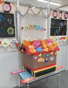 笹の葉は緑の折り紙をちぎって、台紙に丁寧に貼りつけました。工程は集中力が必要でしたが、みんなとても楽しそうでした。