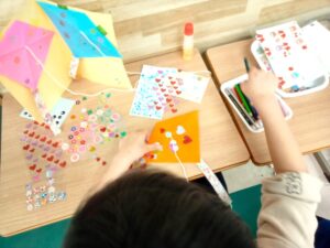 パズル、ポットン落とし、紐通し、洗濯ばさみの4種類を机の上に用意し、お店のように机に並んでいる教材の中から、自分たちで選んで取り組みました。