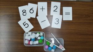 2つ目はお金の計算の練習として、こちらもプリントを使った進め方と絵カードの進め方があります。プリントは書いてあるお金の合計を計算してもらい、商品を買えるかどうか丸をつけてもらうやり方です。