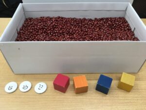 この活動で、親指の対立方向の動きと小指側の指の支える力を育て、えんぴつやはしを上手に操作することに繋がります。