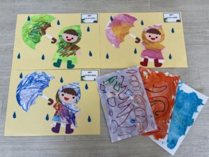 子どもたちが丁寧に模造紙に貼り付けると、そこにはまるで雨上がりの美しい庭のような風景が広がりました。「このアジサイ、ぼくが作ったんだよ!」「このカタツムリ、カラフルでかわいいでしょ?」と、自分の作品を嬉しそうに紹介し合う姿がとても微笑ましかったです。