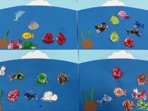「クジラは赤にしちゃおうっと」と、思い思いの色で表現する楽しさを味わっていました。筆使いにも個性が出ていて、それぞれの海の世界が広がっていきます。