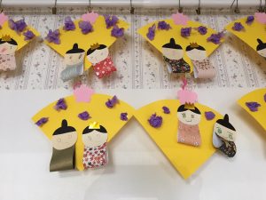 色紙で作った着物姿の胴体に顔を貼って、おひな様とお内裏様の完成です。