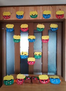 赤オニと青オニが登場し、折り紙で作った豆を(おにはそと、ふくはうち)と言いながら鬼を狙って投げました。