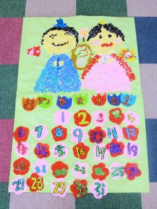 赤と青の箱の中にカラーボールを投げて入れるゲームをしました。ゲームに慣れるために最初は箱の中に自由に投げて入れる練習をしました。箱に向かって「ポイッ」と投げる子やそーっとやさしく入れる子など、子どもたちによって様々な反応が見られました。ゲームに慣れてきたところで、いよいよ本番の二回戦目。赤と青の箱に同じ色のボールを入れる「マッチング」を取り入れたルールで行いました。ゲームが始まると早速ボールを持っていき「おんなじ、おんなじ」と言いながら、箱の色と同じボールを上手に入れることができました。最後に箱の中のボールを見せると、ボールがたくさん入っていたことに大喜びで、「1、2、3」と一緒に数えて盛り上がっていました。