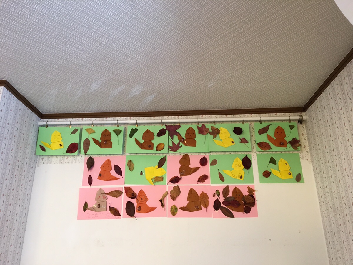 秋のテーマ工作をしました 2018-11-24 最終更新日時 : 2018-11-24 NPO法人輝HIKARI 今週は秋の工作週間に取り組みました。 あらかじめスタッフが折り紙でリスを作っておきました。 子どもたちに顔をかきたしてもらい、お散歩で拾った落ち葉やどんぐりを貼ったら完成です。 壁に飾って、手作りの秋の森ができあがりました。 関連