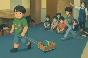 最初の種目は「玉入れ」。子どもたちはチームに分かれ、それぞれの色のボールを探してカゴをめがけて投げ入れます。2回戦では、指定された2色のボールを探すという少し難しいルールにも挑戦。部屋の隅々まで目を凝らしながら、仲間と協力してボールを集める姿が見られました。「入れられなかった…」と悔しそうにしていたお子さんも、先生と一緒に取り組むことで成功し、嬉しそうな笑顔を見せてくれました。