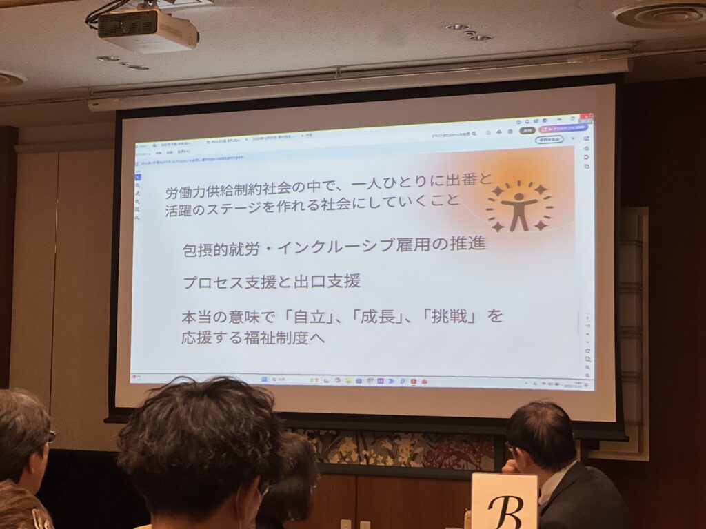 企業にとってメリットのある人材となるよう、実践的な訓練(プロセス支援)を強化する。具体的には、就労継続支援A型(実践の場)と就労移行支援(訓練機能)の良さを併せ持った、新しい福祉的就労の枠組みの必要性を訴えた。