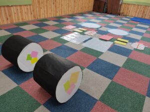 また、もみじやイチョウの葉の形をハサミで丁寧に切ってくれるお子様もいて、「もみじができたよ!」と嬉しそうに報告してくれました。こうして切った葉を壁面に貼り付け、見事な紅葉の壁面が完成しました。