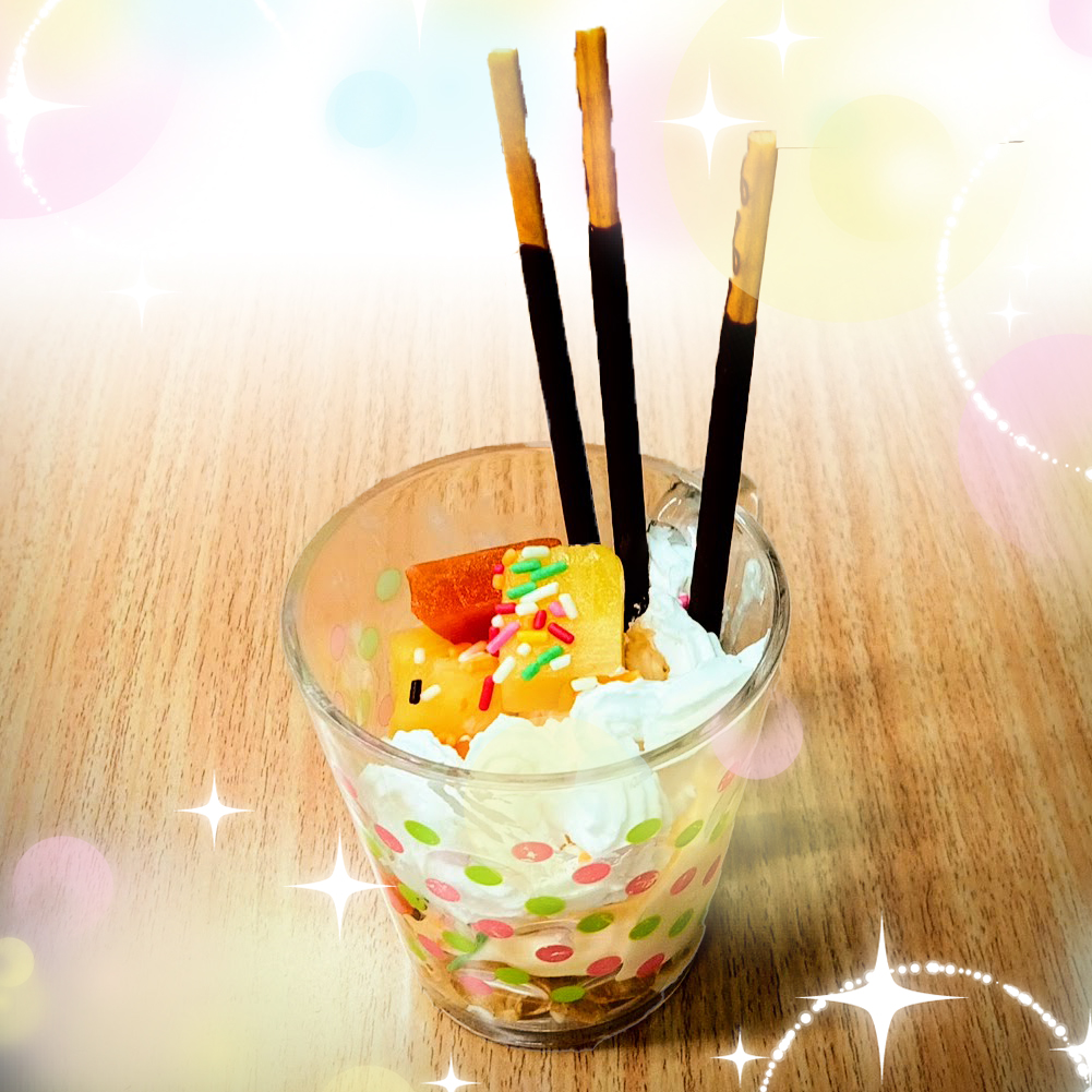 たくさんのポッキーをアイスに差したパフェを楽しそうに「映えー!」と喜んでいました。