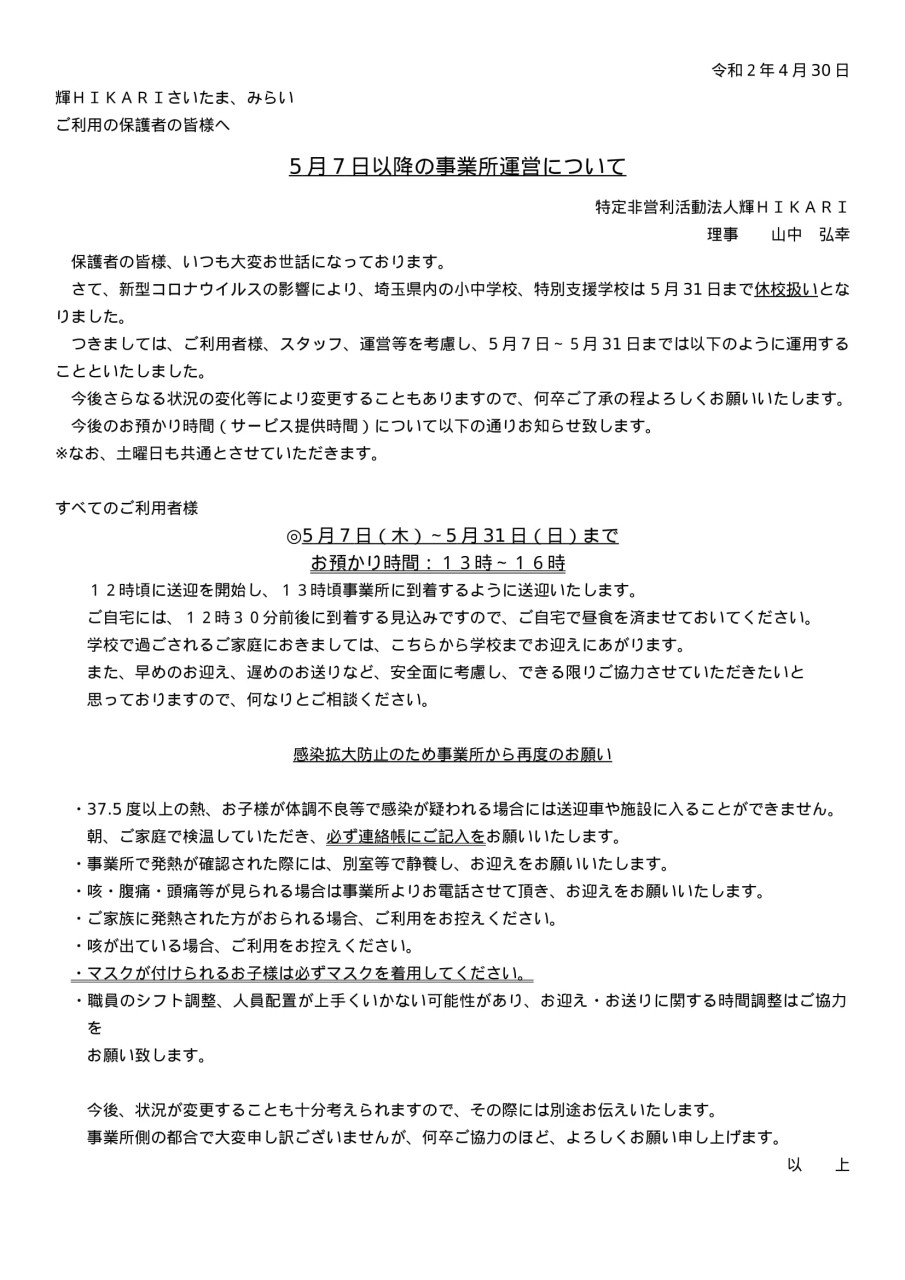 輝HIKARIさいたま・みらいをご利用の保護者の皆様へ 2020-05-04 最終更新日時 : 2025-10-26 NPO法人輝HIKARI 5月の休校延長に対するサービス提供時間NPOのお知らせです。 案内を添付いたしますのでご確認ください。 ご不明点等がございましたら、各施設までご連絡ください。 特定非営利活動法人輝HIKARI 理事 大谷 貴志 関連