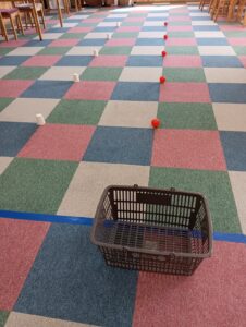 ・2,3週目はゆらゆら縄を揺らし、動いている縄をその場で跳び越える練習です。足型を使い、ジャンプする場所が分かるように設定します。