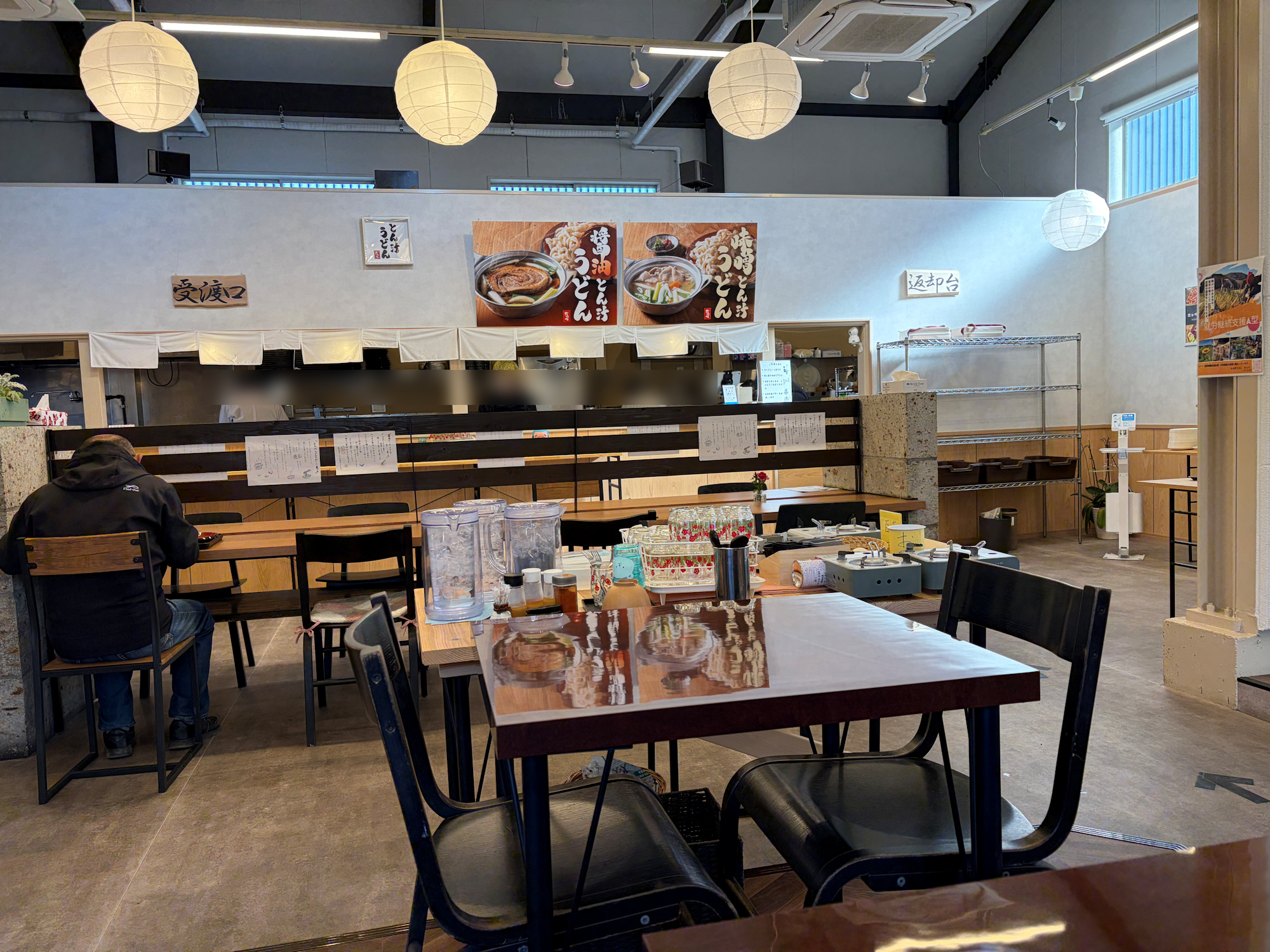 そして中に貼ってあるチラシを見せて頂き「障害のある方が働いている場であり・・・」とお店を説明。その後、カウンターでチケットを購入して、席について、うどんができたらカウンターへ取りに行くセルフサービス方式です。