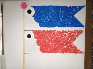 ジップロックにスプーンを使ってスパンコールを入れたり、小さく切ったフィルムをつまんで入れ、最後に洗濯のりを入れて感触を楽しめるこいのぼりにしました。