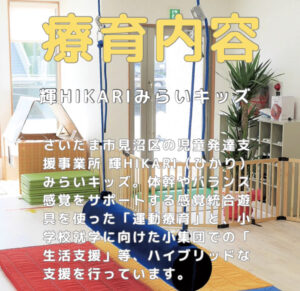輝HIKARIみらいキッズは、令和6年7月から新プログラムとなり、時間枠も新しくなりました。 【平日(月曜日から金曜日まで)】 ①枠 個別支援/9:00~10:30(10時20分にお迎えいただき保護者へ活動のフィードバッ […]