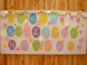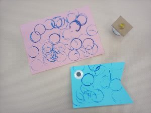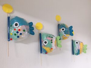 来月の子どもの日に向けて、こいのぼりを作りました。 ビニール袋にお花紙を入れて、色とりどりの模様のこいのぼりにしました。 お花紙の感触を楽しみながら、子どもたち夢中になって袋にたくさん入れていました。